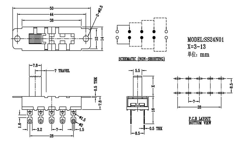 大電流撥動開關是通過撥動開關柄使電路接通或斷開,從而達到切換電路的目的的。大電流撥動開關常用的品種有單極雙位、單極三位、雙極雙位以及雙極三位等,它一般用于低壓電路,具有滑塊動作靈活、性能穩定可靠的特點,大電流撥動開關主要廣泛用于:各種儀器/儀表設備,各種電動玩具,傳真機,音響設備,醫療設備,美容設備,等其它電子產品領域。下面列出了一些撥動開關的主要特性參數及外形結構。