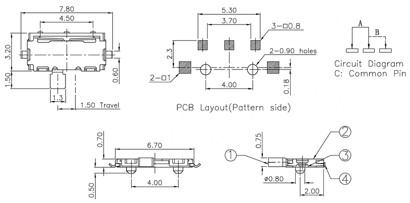 采用臥貼式(Horizontal Mount)編帶包裝,便于自動化貼片生產(chǎn),封裝尺寸6.7×3.2×1.5(手柄可定制高度)mm,重量輕,適合微型化設(shè)備 。